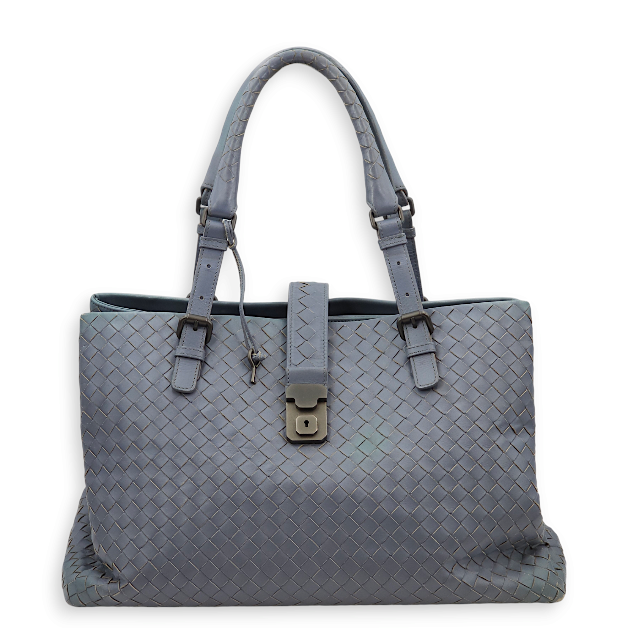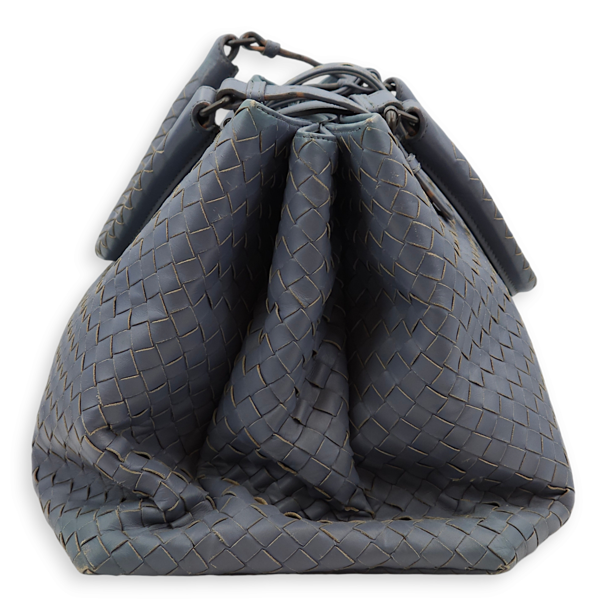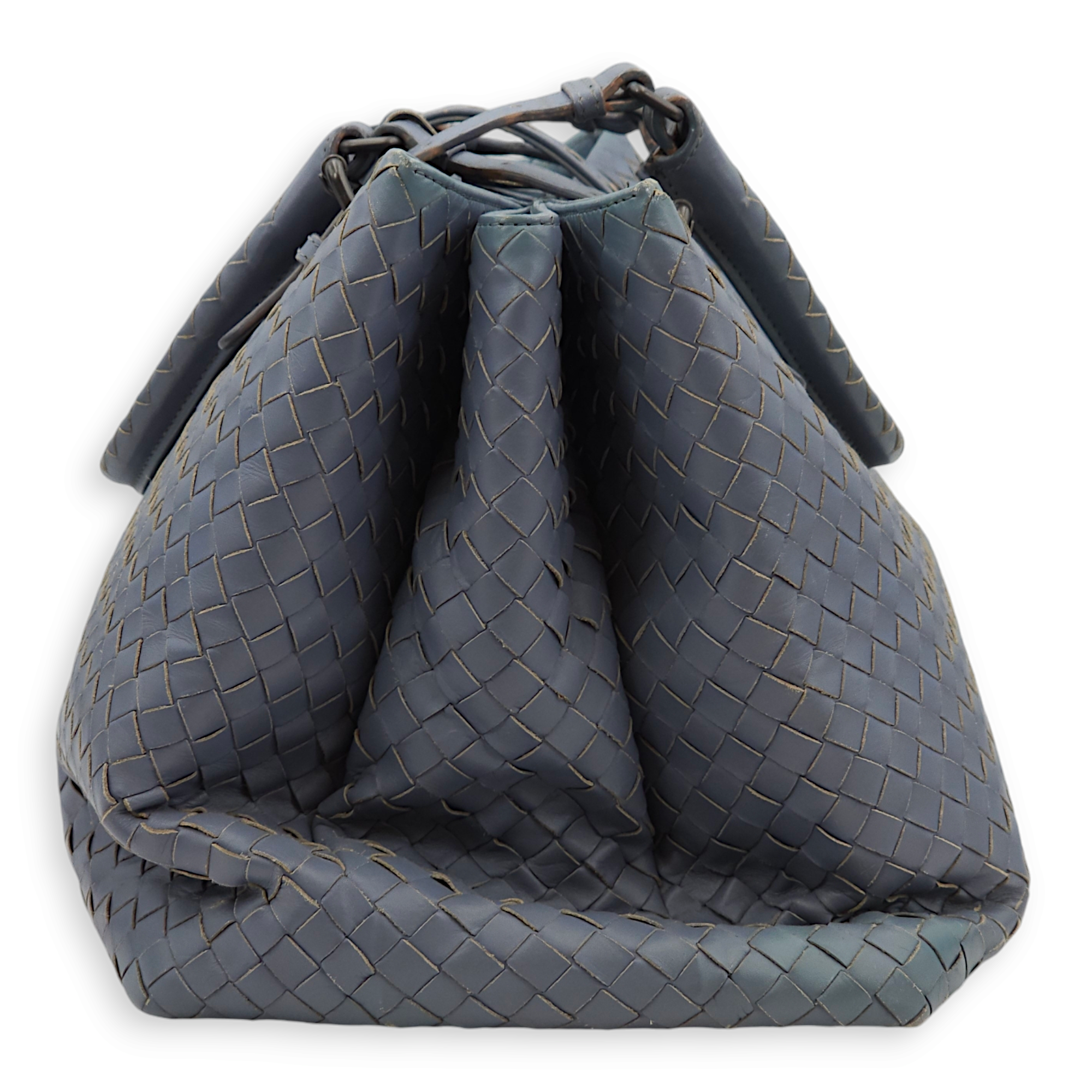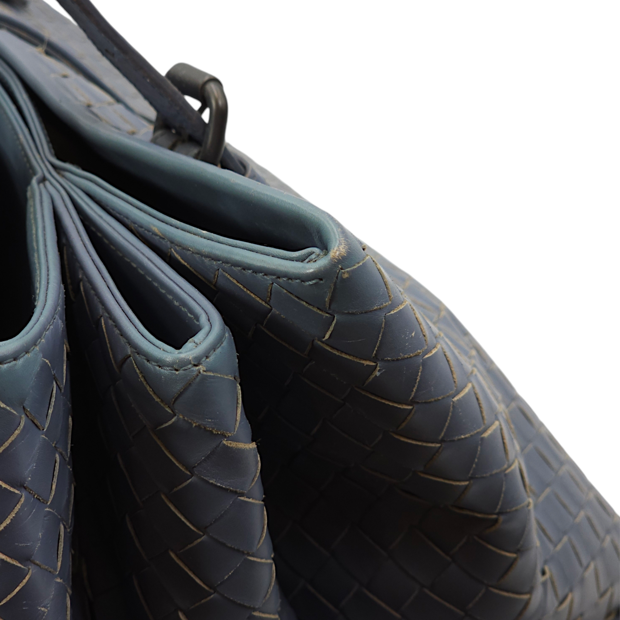 Bottega Veneta Intrecciato Roma Blue Top Handle Bag in Calfskin/Nappa Leather, Brunito hardware Bags Top Handle Bag Blue Fair Condition MEN UNISEX