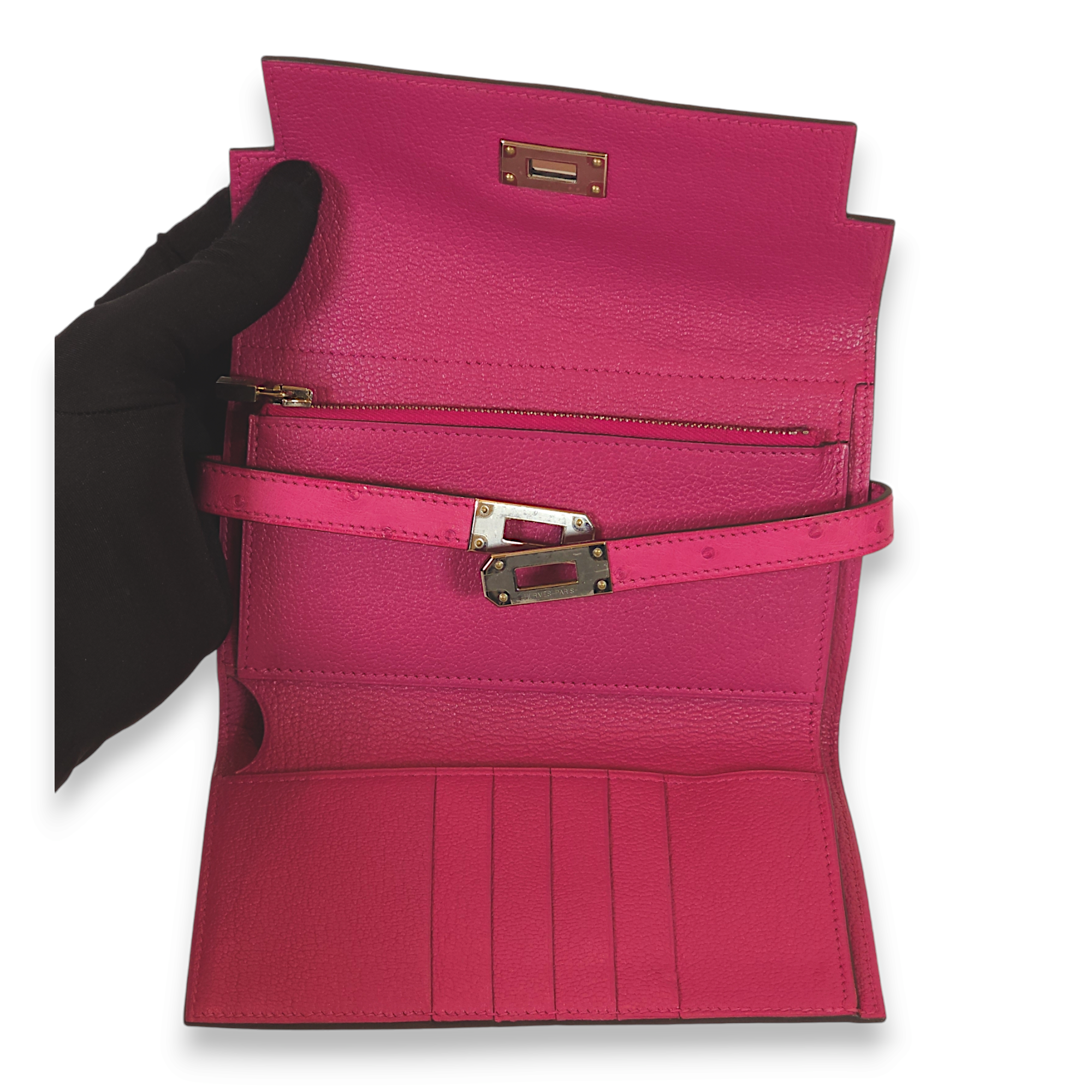 Herm?s Kelly Depliant Rose Pourpre Wallet in Ostrich, Palladium hardware Small Leather Goods Wallet Pink Very Good Condition MEN UNISEX